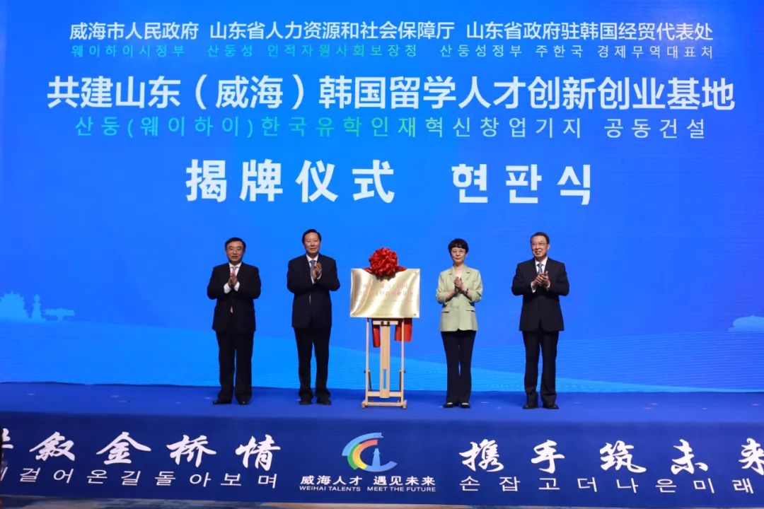 8月4日,“第三届中韩(威海)人才交流合作大会暨韩国留学人才云上对接会”在蓝海御华大饭店举行。大会以“共叙金桥情·携手筑未来”为主题,设置了线上交流推介和留学人才招聘两大板块,通过“云端交流+合作对接+线上直播”的形式,邀请中韩嘉宾、高校代表、企业代表、海外留学人员等1400余人参会。会上,举行了山东(威海)韩国留学人才创新创业基地揭牌仪式,市委副书记、市长孔凡萍,省委组织部副部长、省人社厅厅长梅建华,省政府驻韩经贸代表处首席代表贾继庆,区党工委书记、管委会主任刘伟,共同为山东(威海)韩国留学人才创新创业基地揭牌。