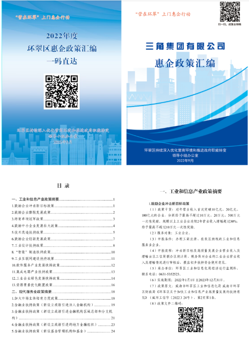 三是创新推动惠企政策精准公开。为了提高政策的精准性、实用性,环翠区创新编制了《2022年度环翠区惠企政策汇编》,按行业类别梳理成政策目录,列明政策干货、适用对象、适用条件、申报流程等核心要素,并提供政策原文的二维码,让企业“按图索骥”、一目了然。同时对重点企业开展“一企一册”政策汇编行动,组织各相关部门对重点企业经营发展情况逐一分析研判,“量身”梳理企业用得上的各类惠企政策,实现了一个企业,一本个性化政策。