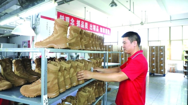 在金猴集团加工车间,新式作战靴源源不断走下生产线。