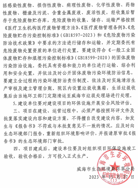 关于威海市中医院治未病中心和门诊楼重建项目环境影响报告书的批复