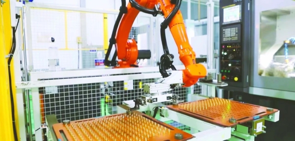 在威海光威户外装备有限公司生产车间内,PLC控制机器人正对机床进行上下料工作
