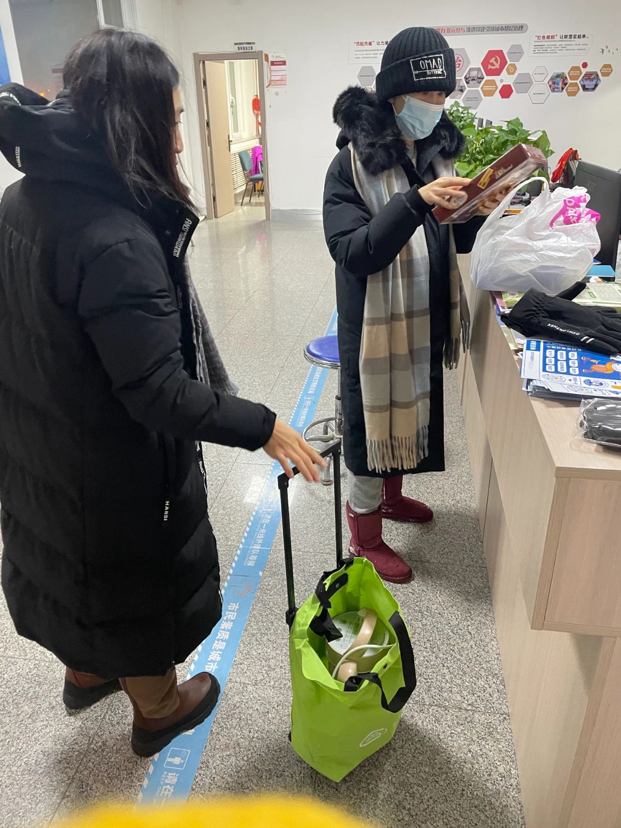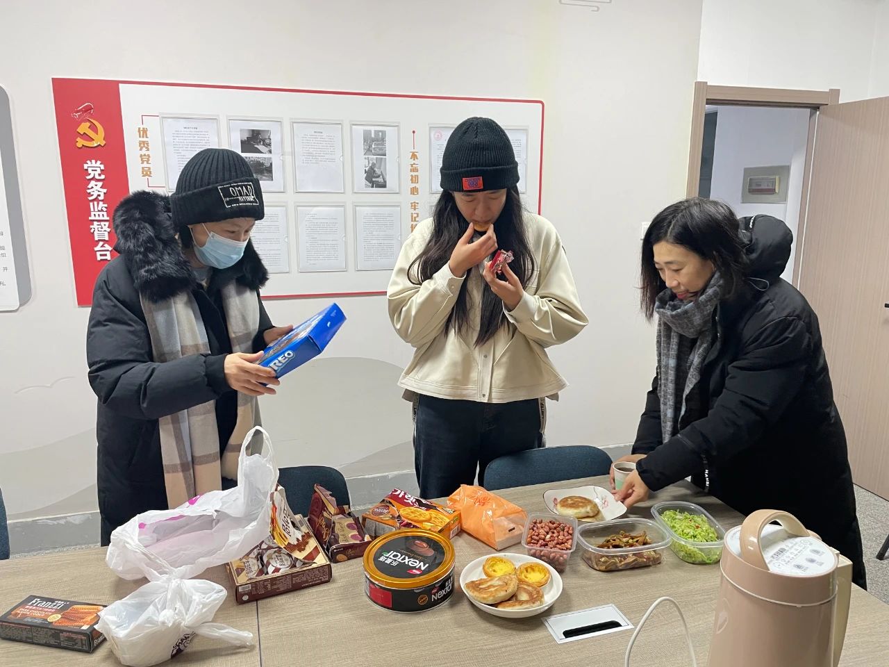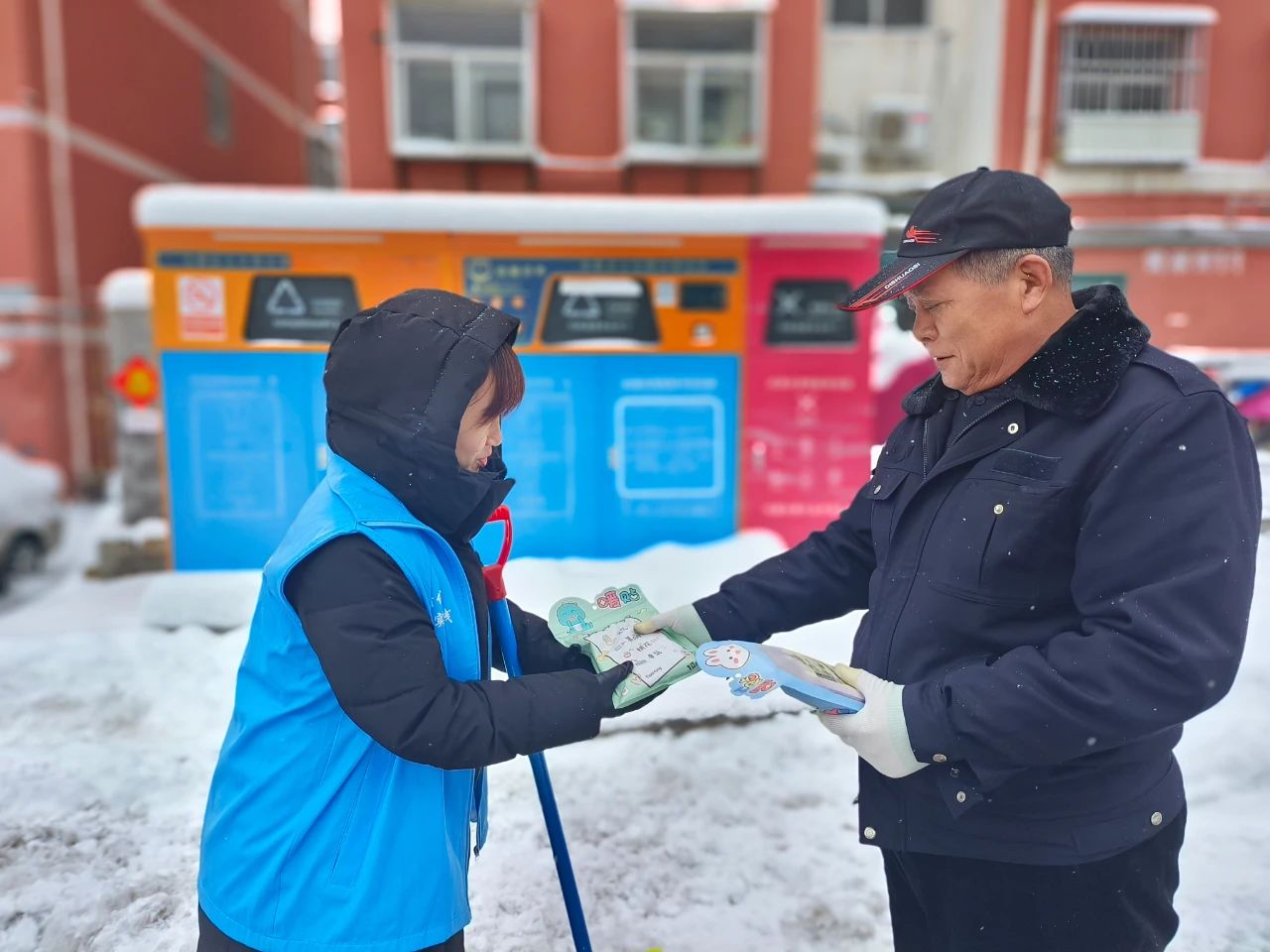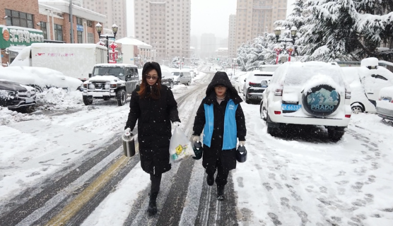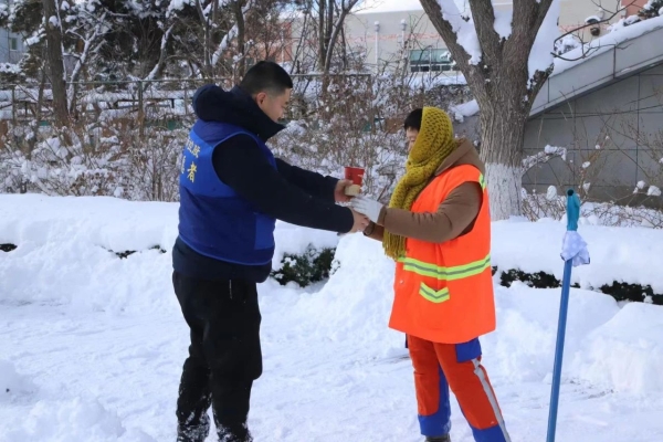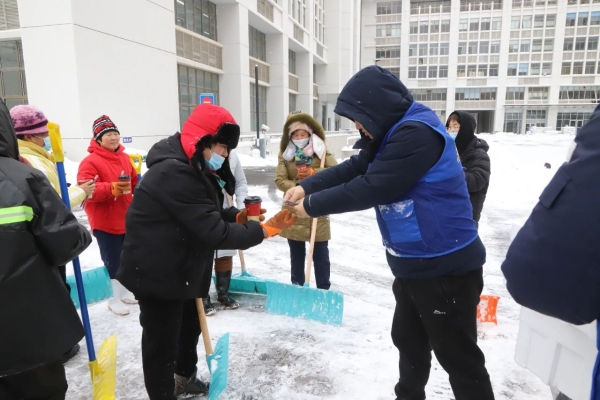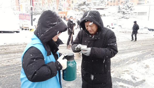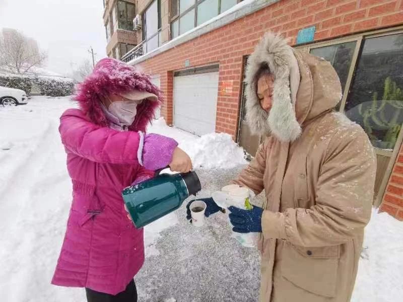 早上5时许,怡园街道怡海园社区收到了一份特殊的早餐“外卖”,居民王蕾带着一大壶热豆浆和自己做的馅饼急匆匆地赶来:“刚出锅的,还热乎着,先吃饱了再出去清雪。知道你们这个点就要开始清雪,紧赶慢赶地过来了。”