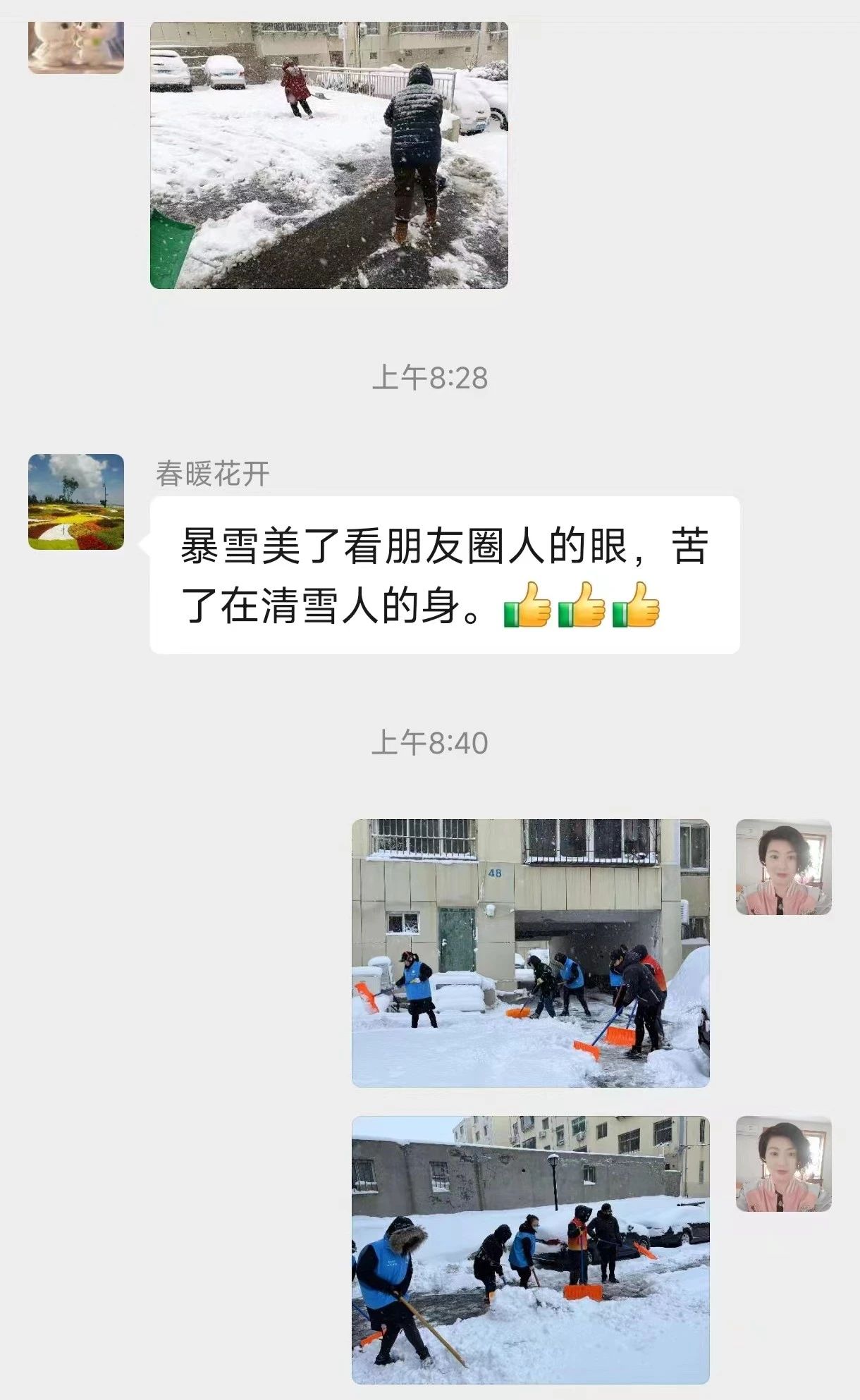 网格群里居民为清雪队伍点赞