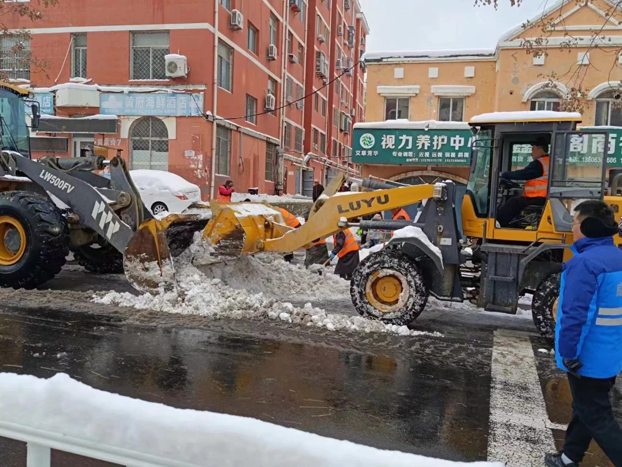 17日凌晨,高区建设局组织出动各类清雪设备车辆214台,保障市政主干道畅通。紧接着,900余名机关企事业单位干部下沉到63个共建社区,充分发挥示范引领作用,投身到清雪行动中,大家齐心协力,扫的扫、铲的铲,顶风冒雪埋头干,尽力将路面清扫干净,保证群众安全出行。