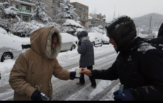 “喝口姜汤暖和暖和吧!”在田和街道笔架山社区,热火朝天的清雪现场因一杯杯热气腾腾的姜汤又“升温”了。社区居民黄秀花正忙活着把姜汤从保温壶倒到杯子里,她说:“都是用红糖和大枣熬的,甜着呢。早上看到楼下这么多志愿者在清雪,很感动,冰天雪地里为老百姓服务,我们也想做点什么表示感谢,就熬点姜汤给大家暖暖身子。”