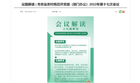 三是创新开展议题解读,拓展会议公开深度。聚焦群众急需、回应社会关切,市农业农村局以民生服务为靶向,创新会议解读形式,选定重点会议议题,从议题背景、议题事项、决策依据、目标任务、重要举措等5大方面进行深度解读,以图文形式向社会公众展示解读内容,切实帮助群众了解和参与机关建设,同时实现集思广益、广开言论的目的,有效提高会议质量和实效。