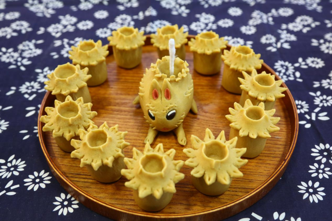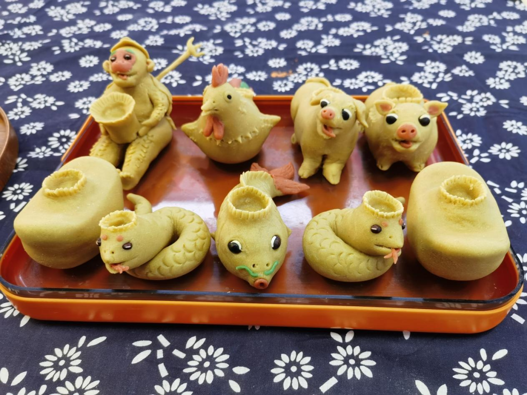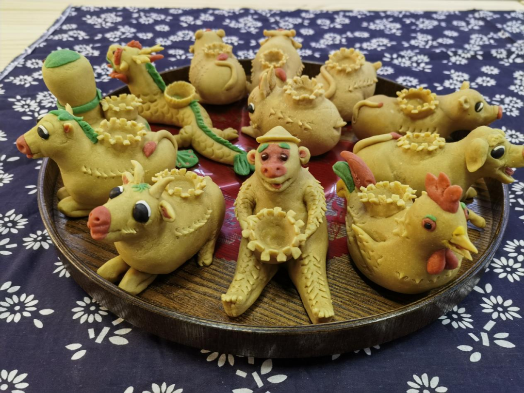 面灯通常使用豆面或者普通面粉制作,分为生肖灯、月灯和其他散灯等。生肖面灯是按照家里每个人的属相,对应制作的生肖造型面塑。制作生肖面灯时,还有个有趣的说法,捏“属儿”的过程只能一次成型,不能半途毁掉重做,也寓意人生没有重来的机会,要认真对待每一天、每一件事。“做成啥样是啥样,说它是啥就是啥。这种偶然性也是制作面灯最大的乐趣。”苏春霞说。