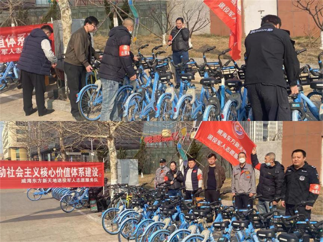 威海东方新天地退役军人志愿服务队,在学雷锋纪念日,组织退役军人骨干志愿者,发挥退役军人先锋带头作用,沿街整齐摆放共享单车,助力全市文明城市创建工作顺利进行。(李超)