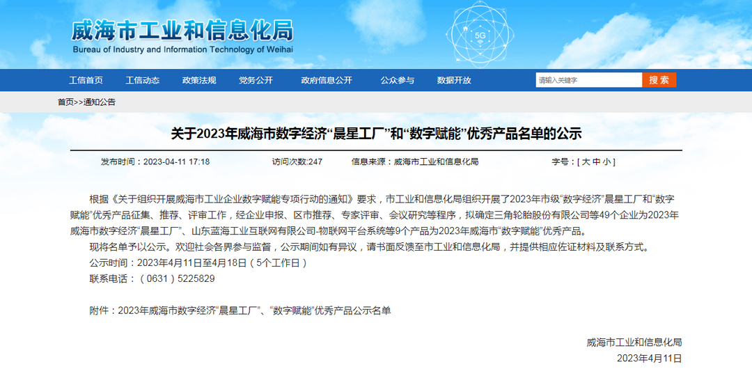近日,威海市工业和信息化局公示了2023年威海市数字经济“晨星工厂”和“数字赋能”优秀产品名单, 威海纺织集团进出口有限责任公司、威海市联桥国际合作集团有限公司、山东新北洋信息技术股份有限公司等9家企业获评市级市数字经济“晨星工厂”,山东蓝海工业互联网有限公司、威海蓝天科技有限公司、山东琅卡博能源科技股份有限公司3家企业申报的产品获评市级“数字赋能”优秀产品!