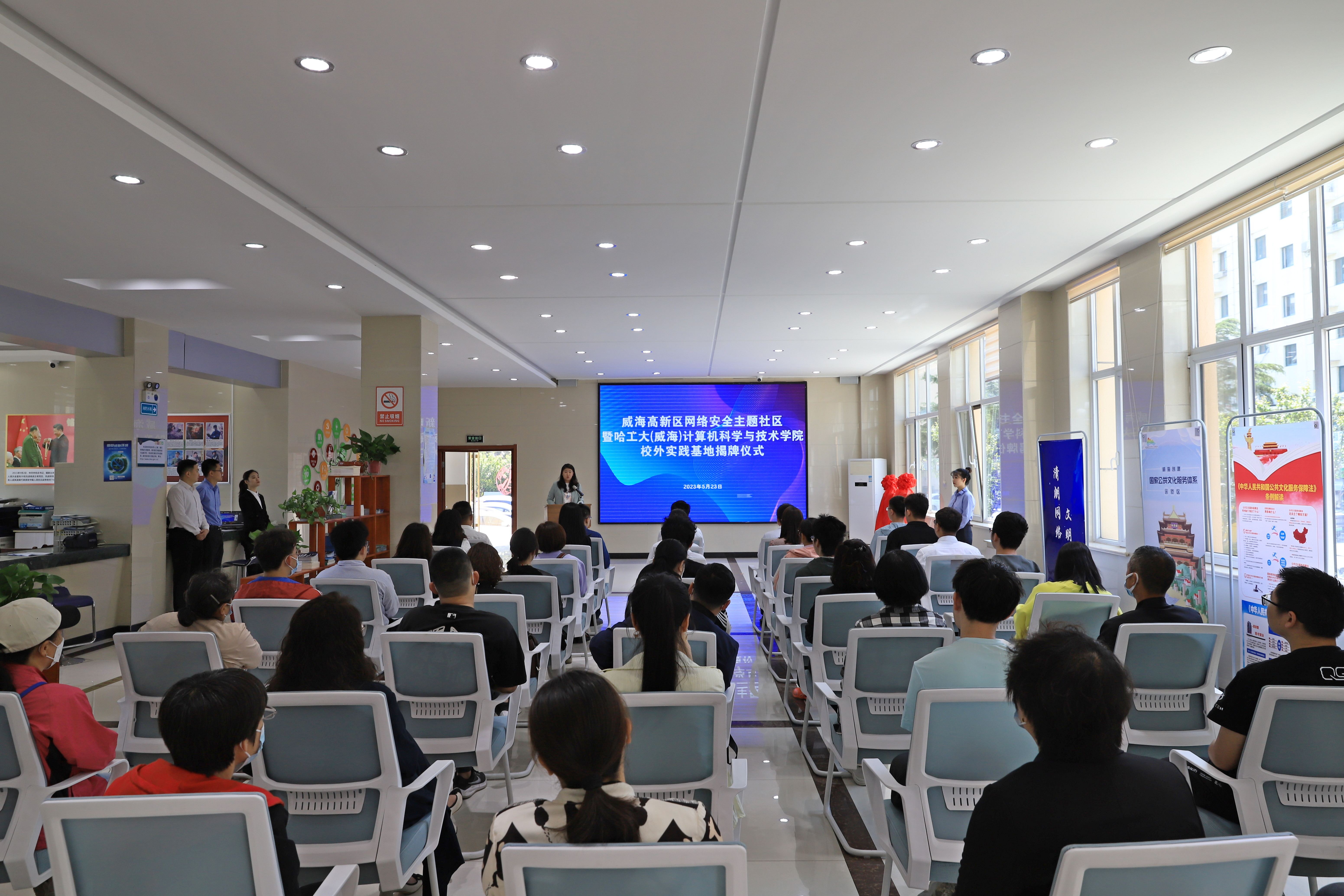 5月22日,高新区网络安全主题社区授牌暨哈工大(威海)计算机科学与技术学院校外实践基地揭牌仪式,在田和街道新田社区举行,哈工大(威海)计算机科学与技术学院向新田社区捐赠相关图书500册。