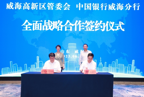 6月26日,高新区与中国银行威海分行签署全面战略合作协议。中国银行山东省分行党委书记、行长徐效强,市委副书记、市长孔凡萍,中国银行山东省分行党委委员、副行长胡冲,中国银行山东省分行公司金融部总经理毕晓鹏,高新区党工委书记、管委会主任梅延良,中国银行股份有限公司威海分行行长丁瑞梁出席签约仪式。梅延良、丁瑞梁分别致辞。区领导丛培杰主持。
