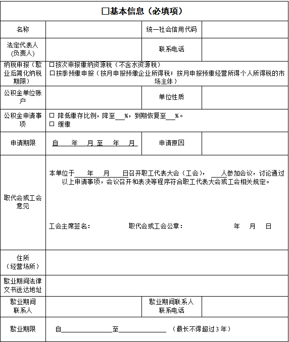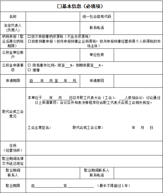 (五)允许住房公积金缓缴。市场主体歇业期间,仍与职工存在劳动关系的,应按照《住房公积金管理条例》规定依法为职工缴存住房公积金;缴存确有困难的,可依法申请降低缴存比例或缓缴住房公积金,待经济效益好转后,再提高缴存比例或者补缴。降低缴存比例或缓缴期限一般不超过一年。期满后仍需降低缴存比例或缓缴的,应当再次办理申请手续。(责任单位:省住房城乡建设厅)