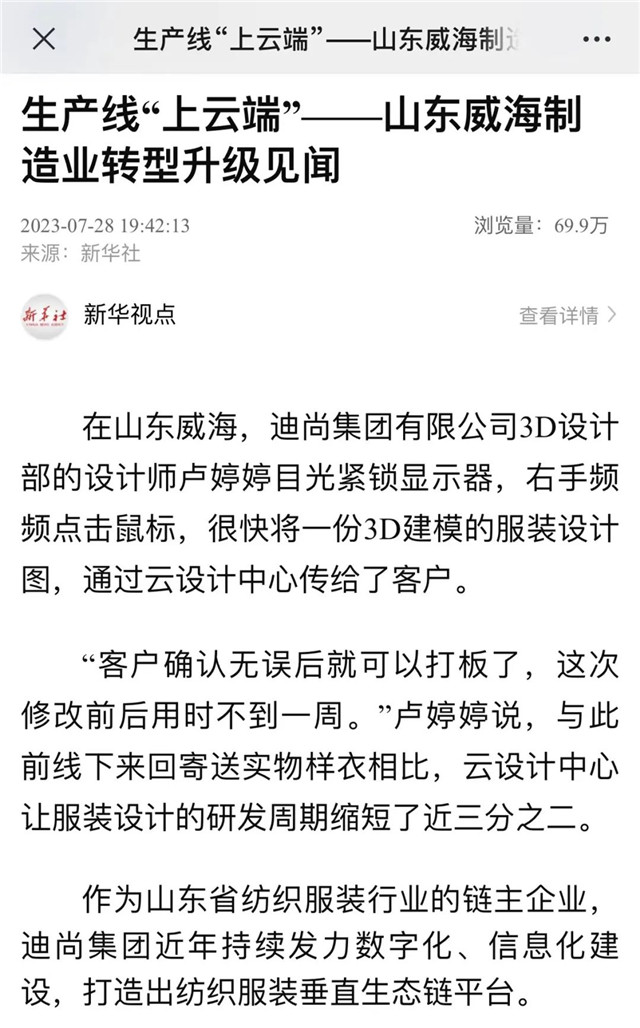 作为山东省纺织服装行业的链主企业,迪尚集团近年持续发力数字化、信息化建设,打造出纺织服装垂直生态链平台。