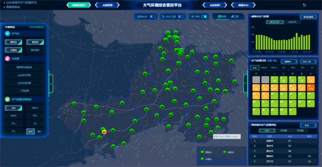 一是全域感知,大气环境监测覆盖“无死角”。扎实推进环境空气质量监测网络建设,建成覆盖全市的72个镇街级以上空气质量自动监测站、2个VOCs自动监测站、2个交通污染监测站、107台移动车载大气监测设备,进一步投资建设威海空气质量超级站,对大气污染物来源进行科学解析、精准溯源,为精准治污、科学治霾及区域联防联控提供强有力的科技支撑。同时强化智能监管技术应用,通过物联网设备对企业产治污设备用电情况、治理设施运行工况等进行实时监控,提高对涉气排污企业的监测、评估和预警能力,推动环境治理中心向源头控制和过程监管延伸,拓展“非现场监管”新空间,实现对PM2.5、PM10的精准化治理、精细化管控。