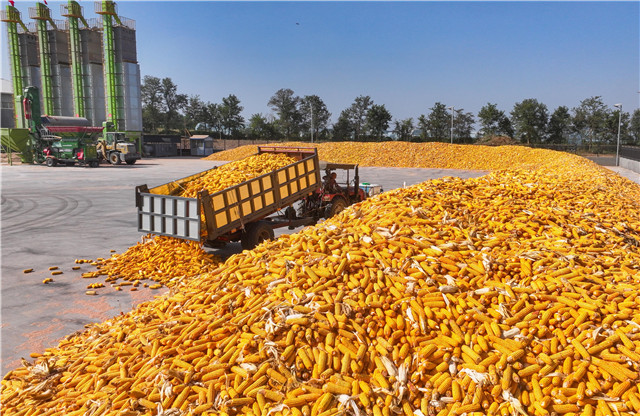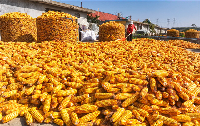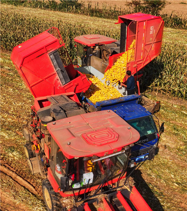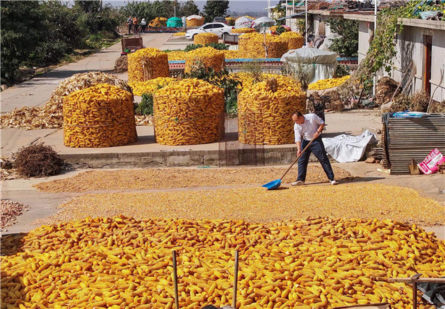 10月12日,在荣成市上庄镇东桥村,村民们正在收获、晾晒玉米。