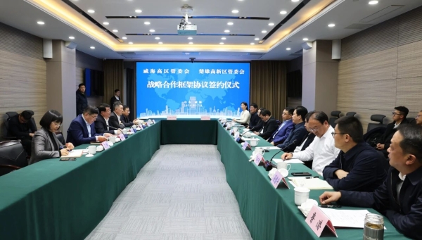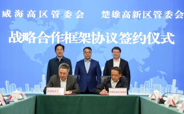 3月10日,威海高区与云南楚雄高新区签订战略合作框架协议,共谋发展新机遇。云南省科技厅厅长王学勤,楚雄州人民政府副州长王秀江,威海高区党工委书记、管委会主任梅延良出席并见证签约,楚雄高新区管委会副主任鲁潜,区领导赵林、丛培杰参加签约仪式。