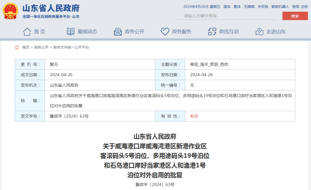 你市《关于威海港口岸威海湾港区新港作业区客滚码头5号泊位、多用途码头19号泊位和石岛港口岸好当家港区人和渔港1号泊位对外启用的请示》(威政请字〔2024〕6号)收悉。经省政府有关部门和中央驻鲁口岸查验单位验收,威海港口岸威海湾港区新港作业区客滚码头5号泊位、多用途码头19号泊位和石岛港口岸好当家港区人和渔港1号泊位符合对外启用条件,批准其对外启用。