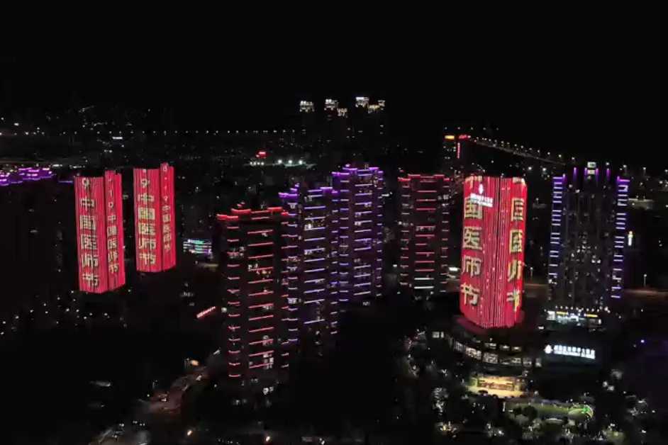 8月19日晚,在全市多个地标性建筑上演庆祝灯光秀,向医务工作者致敬。