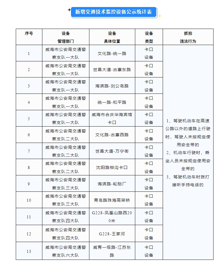 威海市公安局交通警察支队关于新增交通技术监控设备的公示