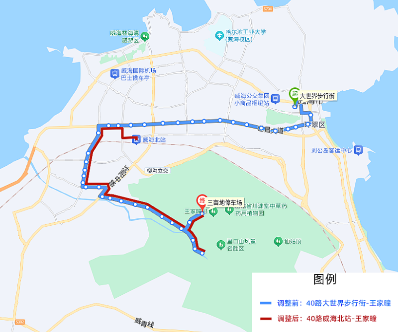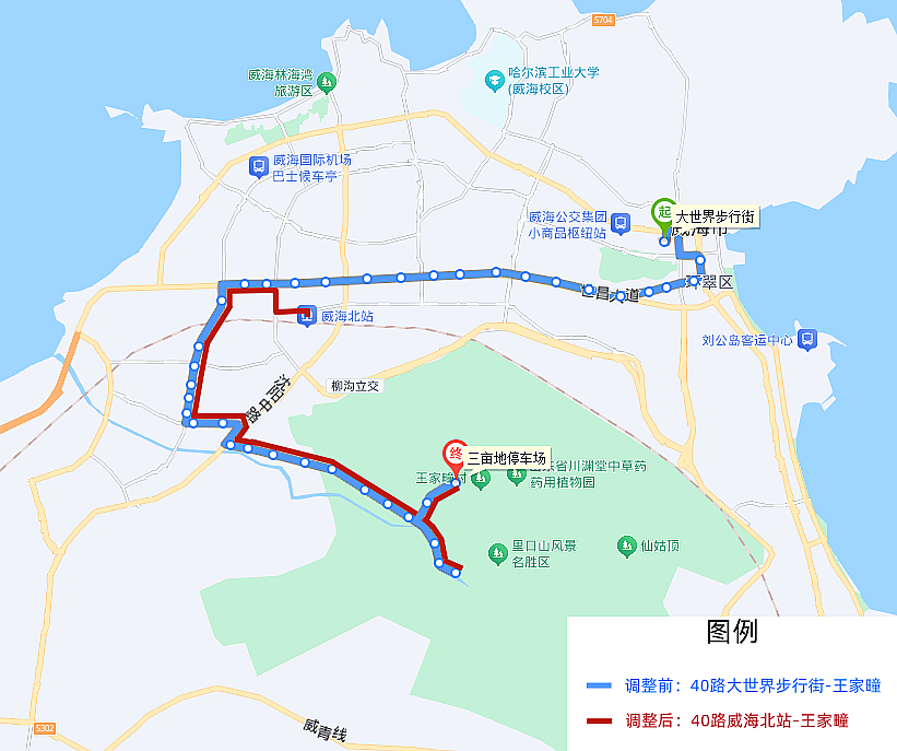 40路首末站由大世界步行街调整至威海北站,调整后,由威海北站发车沿环山路、科技路、世昌大道至光威集团站点恢复原线路运行至王家疃。