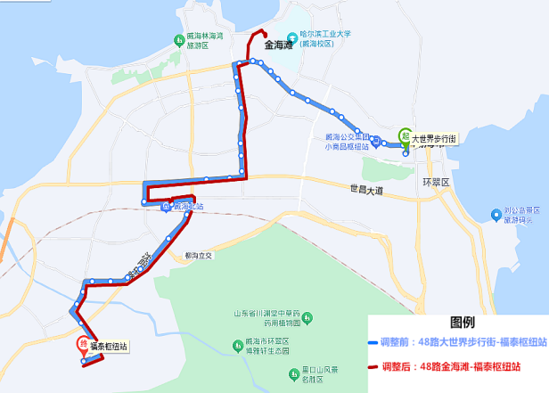 48路首末站由大世界步行街调整至金海滩,调整后,由金海滩发车沿环海路、长春路、文化西路至西文化生活区站点恢复原线路运行至福泰枢纽站。