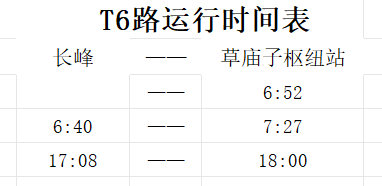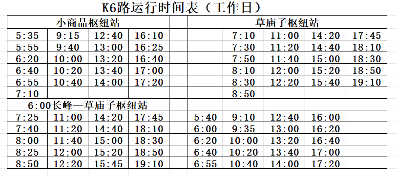 运行时间:长峰(中诺口腔)6:40、17:08;草庙子枢纽站6:52、7:27、18:00;K6路工作日运行计划同时优化调整(详见附件)。