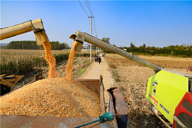 10月28日,在文登区泽头镇连片的玉米田里,加长筛板履带式收获机“隆隆”作业,一垄垄玉米秆被稳稳“吞”进机身。等收获机粮仓装满玉米,闸门一打开,金黄的玉米粒“哗哗”倒进运粮车,堆起了“小山”。