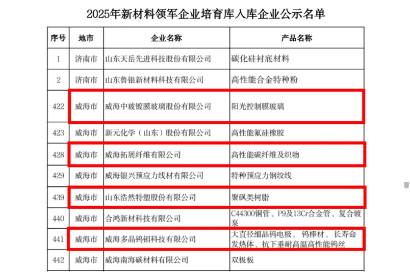 近日,记者从区经济发展局获悉,山东省新材料领军企业培育库入库企业名单公布,我区的威海中玻镀膜玻璃股份有限公司新入选,威海拓展纤维有限公司、山东浩然特塑股份有限公司、威海多晶钨钼科技有限公司通过复核,展现了临港区在新材料领域的强劲实力与持续创新能力。