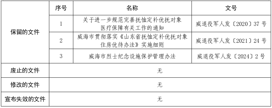 威海市退役军人事务局2025年度规范性文件清理结果
