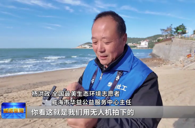全国最美生态环境志愿者、威海市华益公益服务中心主任杨洪政说,这就是用无人机拍下的一些陡峭的礁石旁边的漂浮物,这块人下不来也看不着,这时候无人机就派上用场了,像威海湾就有20个这样的无人机监测点位,发现问题后,他们上报相关部门,在天气允许情况下派船只和志愿者过来打捞。