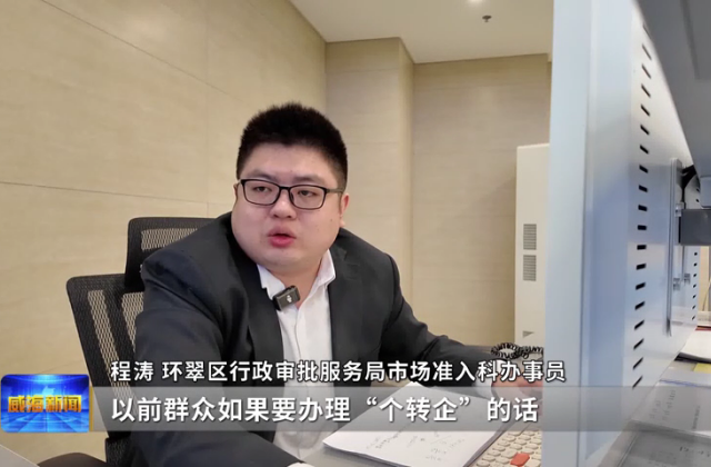 环翠区行政审批服务局市场准入科办事员程涛:以前群众如果要办理“个转企”的话,要先把个体的营业执照注销,然后重新再去办理新公司的营业执照,现在就都不需要了。有“个转企”端口会拿她身份证先查一下她的企业信息,没有什么问题的话,就会跟税务那边联系一下,请开一个清税证明同步帮她准备需要的一些材料,群众确认材料没有问题了以后,电子签名,就可以给她办结了。