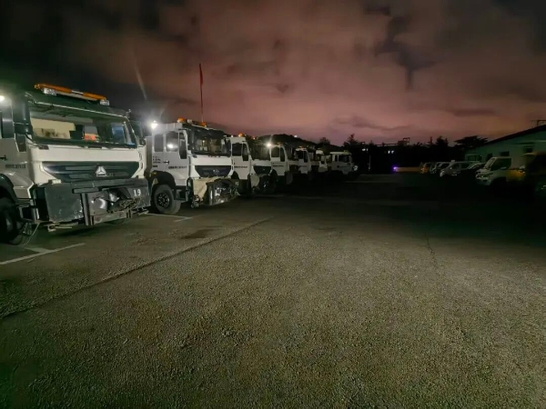 12月2日,降雪如期而至,高区市政严阵以待,除雪物资设备储备充足,130余台早已完成全面检修的撒布机、推雪铲、清运车等大型清雪设备整齐停放在指定场地,整装待发,为高强度清雪作业提供坚实物资支撑。