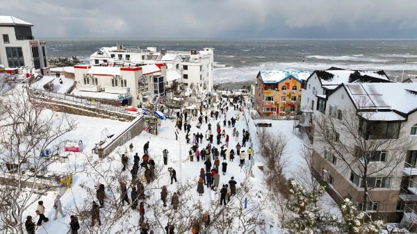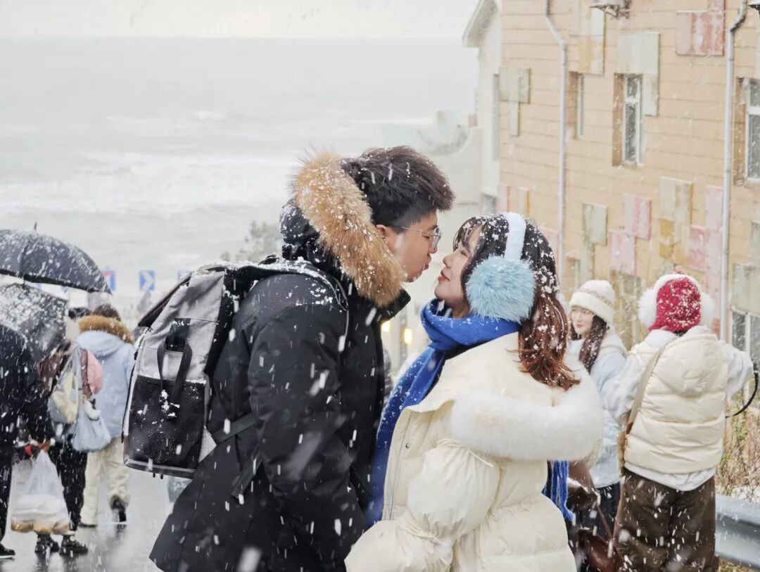 邂逅冬日浪漫,无数游客被火炬八街的冬日限定美景戳中,到处可见游客们举着相机定格飞雪与海天一色的同框画面,感受飞雪与海浪声交织成独特的冬日乐章。