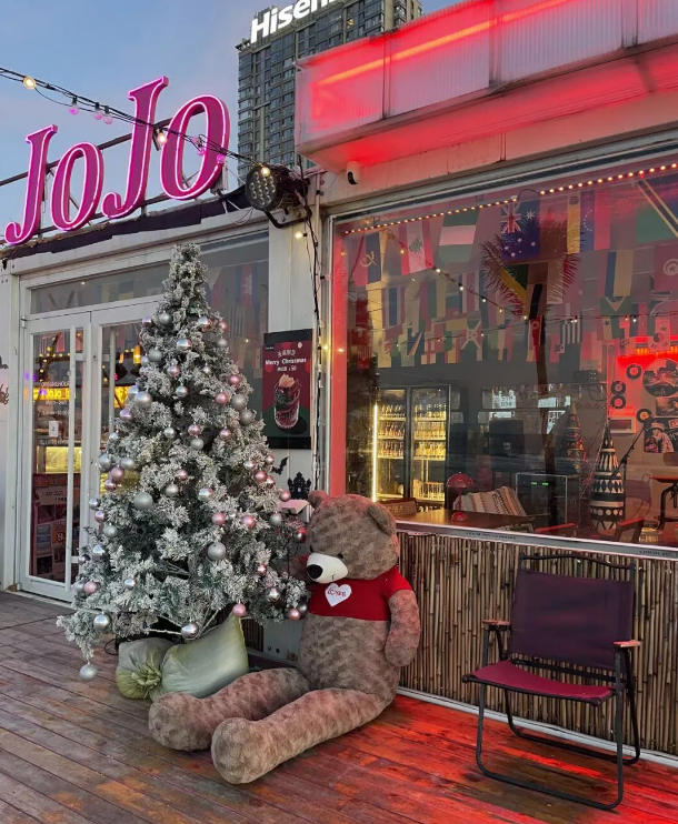 走在火炬八街上,邂逅“I am jojo”,商家用造雪机为游客编织了一场专属梦境。洁白的“雪花”缓缓飘落,与远处的海景相映成趣,打造出“海边雪景”沉浸式氛围。