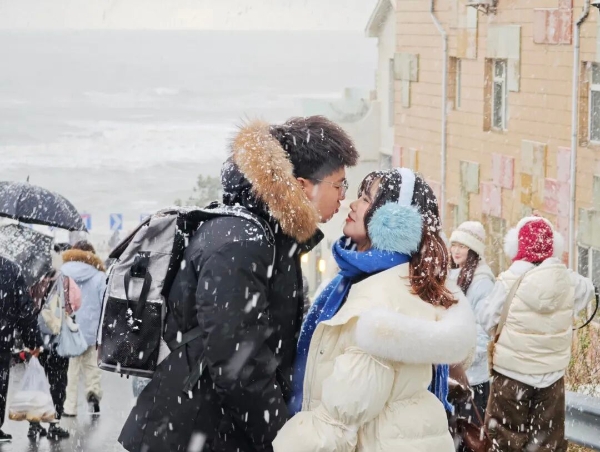 河南濮阳游客贺子壮特意选择来威海度蜜月,在火炬八街开启浪漫之路。“非常幸运,第一天来火炬八街就遇到下雪。在这样的冬天,和爱人一起漫步街区,成为我们最好的浪漫告白。”贺子壮说。