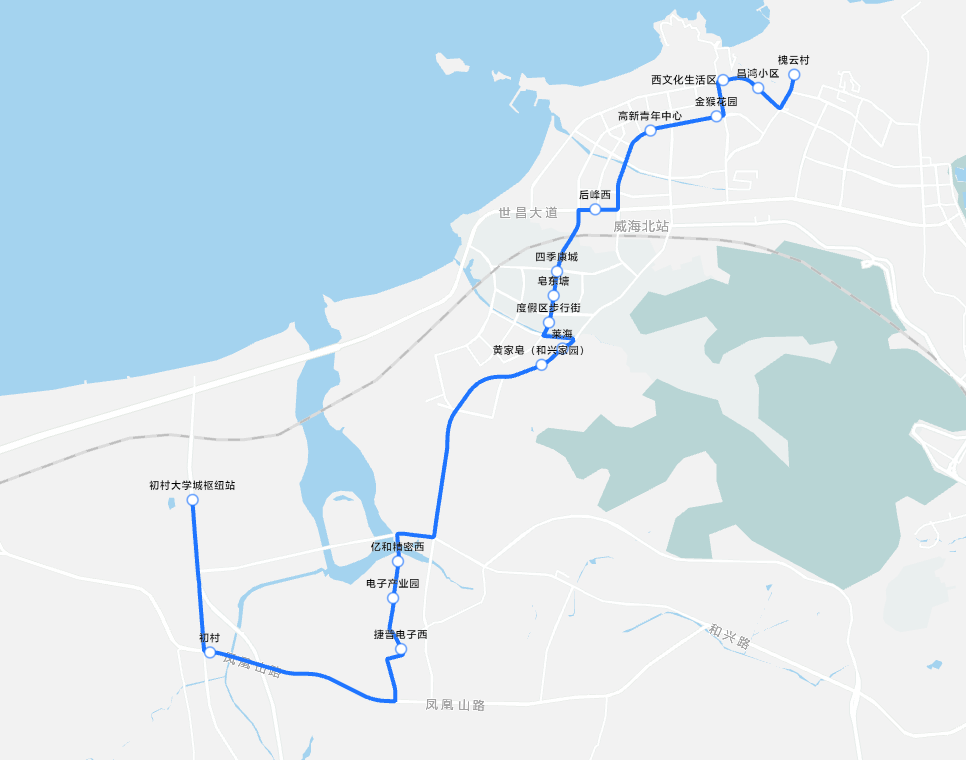 2.站点设置:槐云村、昌鸿小区、西文化生活区、金猴花园、高新青年中心、后峰西、四季康城、皂东塘、度假区步行街、莱海、黄家皂、亿和精密西、电子产业园、捷普电子西、初村、初村大学城枢纽站共16个站点。