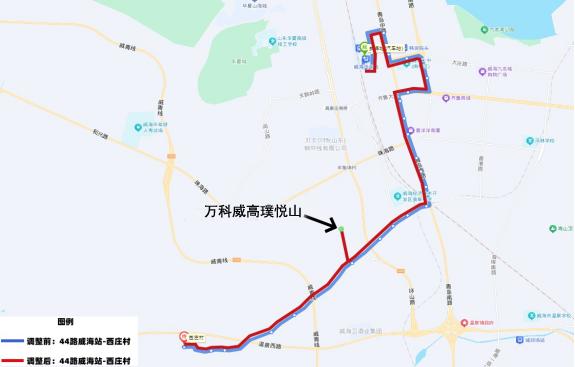 44路由威海站发车,按原线路运行至东山口站点,改行璞悦山小区内部路至万科威高璞悦山站点,调头按原线路行至西庄村,增设万科威高璞悦山1个站点。