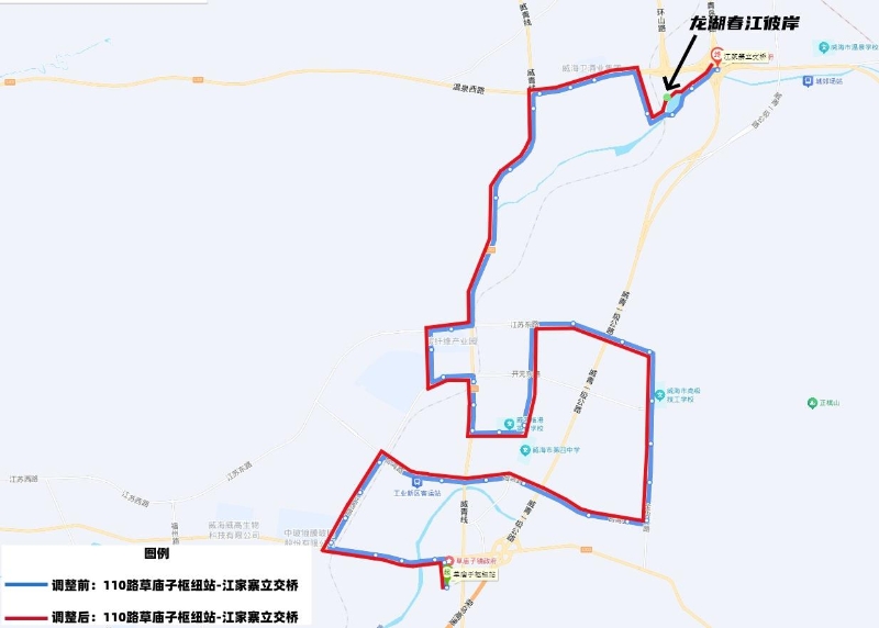 110路由草庙子枢纽站发车,按原线路运行至六和园康养中心站点,改行柳河路、统一南路、寨南路至万象一品小区站点恢复原线路运行,取消云顶阳光小区1个站点,增设龙湖春江彼岸1个站点。由江家寨立交桥发车按原线路运行。