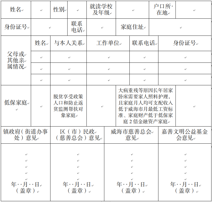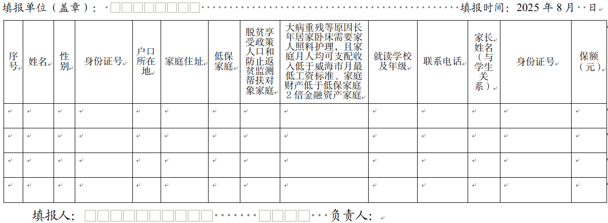 (三)审批和投保。区(市)民政、慈善部门审批,区(市)慈善总会留存公示资料并填写《威海市2025年度正嵩·扬帆护航困难学生平安保险项目资助汇总表》(附件2),连同附件1及相关申请材料一并于2025822日前报送威海市慈善总会。威海市慈善总会、天罡仪表审核后,由天罡仪表选择的华泰财产保险有限公司承保。