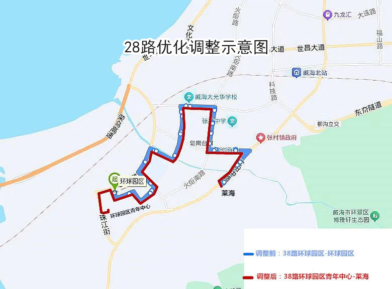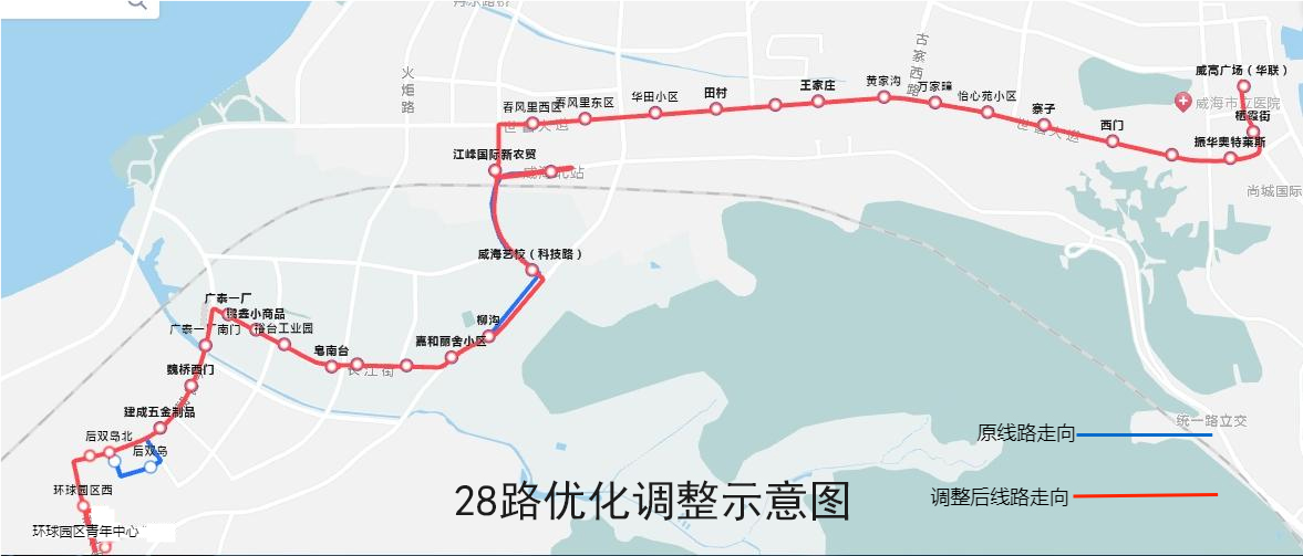 调整后,28路由威高广场(华联)发车,按原线路运行至建成五金制品站点,改行环翠路、珠江街至环球园区青年中心,取消环球园区(漓江街)、后双岛工业园2个站点,增设环球园区(环翠路)、环球园区西、和徐疃村(单向停靠)、环球园区青年中心4个站点。