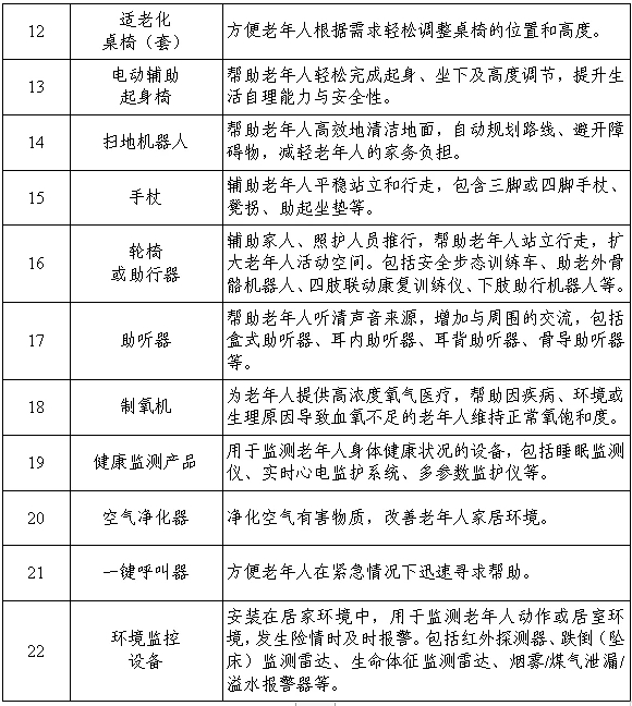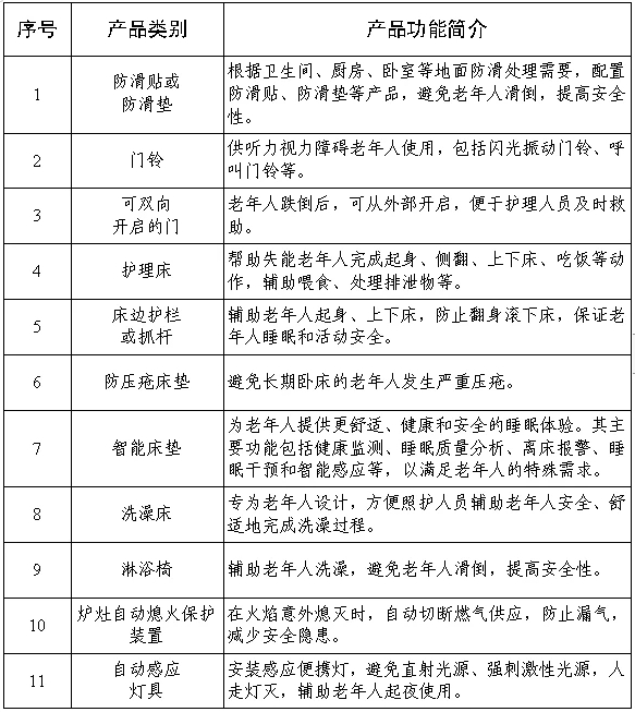 地面和门改造、卧室改造、如厕洗浴设备改造、厨房设备改造、物理环境改造、智能辅助产品等22类。具体补贴产品类别参照下列清单。