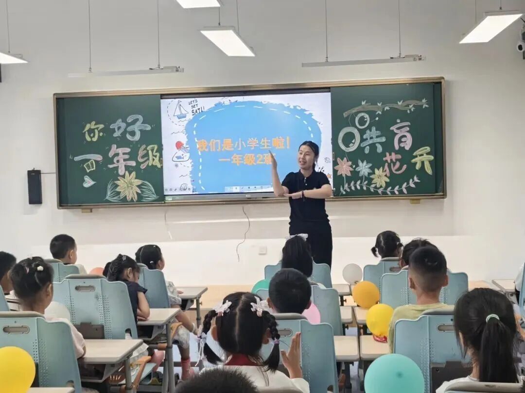 高区一小通过充满仪式感的入学活动,为一年级萌娃开启小学旅程。孩子们敲响启智鼓,跨过祝福跨栏,清脆的笑声在校园里回荡。教室里,老师为孩子们递上系着丝带的新课本和彩色气球,并鼓励孩子们端正坐姿、自信展示,结识新朋友,让孩子们从独立个体逐渐融入温暖集体,成为照耀彼此的“小星星”。
