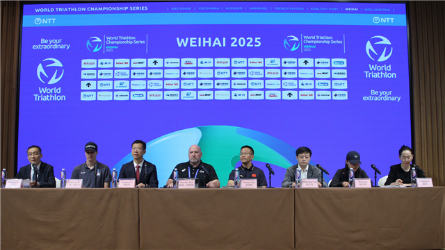 9月25日,“中路保险杯”2025年威海铁人三项世界锦标赛组委会举行新闻发布会,世界铁人三项联合会执委彼得·德维特,亚洲铁人三项联合会执委、中国铁人三项运动协会秘书长秦建秋,威海市体育局局长李映华,山东齐鲁体育产业发展有限公司董事长杨宏双,运动员代表亨利·格拉夫、陆美伊,介绍“中路保险杯”2025年威海铁人三项世界锦标赛有关情况。