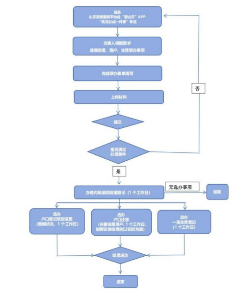 (一)线上办理。当事人可以直接通过登录山东政务服务平台(http://www.shandong.gov.cn/col/col94091/)“高效办成一件事”专区或登录“爱山东”APP 平台“高效办成一件事”专区进入“结婚落户一件事”主题集成服务模块,进行结婚登记网上预约和户口登记项目变更(婚姻状况)、户口迁移(夫妻投靠落户)、生育登记的在线申请。
