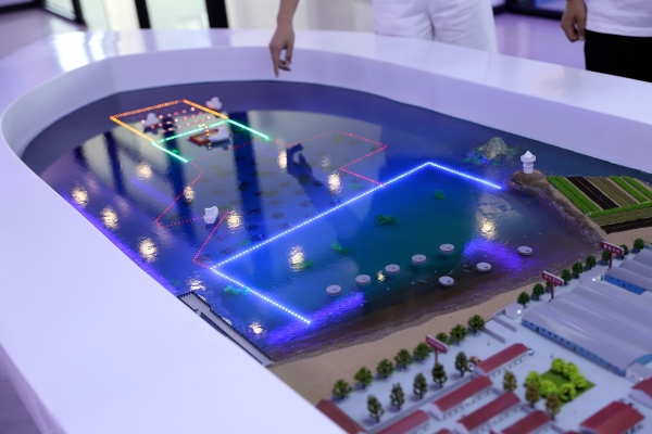 双岛湾西侧海域是瑜泰国家级海洋牧场所在地,300多公顷的海域里,多营养层次生态立体综合养殖模式正悄然运作。通过公司沙盘可以清晰看到,瑜泰水产在远海、中间、近岸三个区域分别规划出了筏架养殖区、人工鱼礁区、底播增殖区。