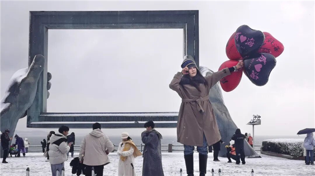 除了这些“有备而来”的游客,不少人还收获了意外之喜。来自广东的邹琳琳原本计划昨天就结束旅行,踏上返程的列车,前一晚听说今日有雪,她当即决定改签,延迟行程。“活了30多年,这是我第一次见这么大的雪!”站在幸福门广场上,邹琳琳仰头望着漫天飞舞的雪花,忍不住感叹“威海真的好靓哦!”她特意将威海的最后一站定在幸福门,不仅看了雪后海滨的景色,还体验了喂海鸥的乐趣,洁白的海鸥在雪中盘旋,被她永远定格在相机里。