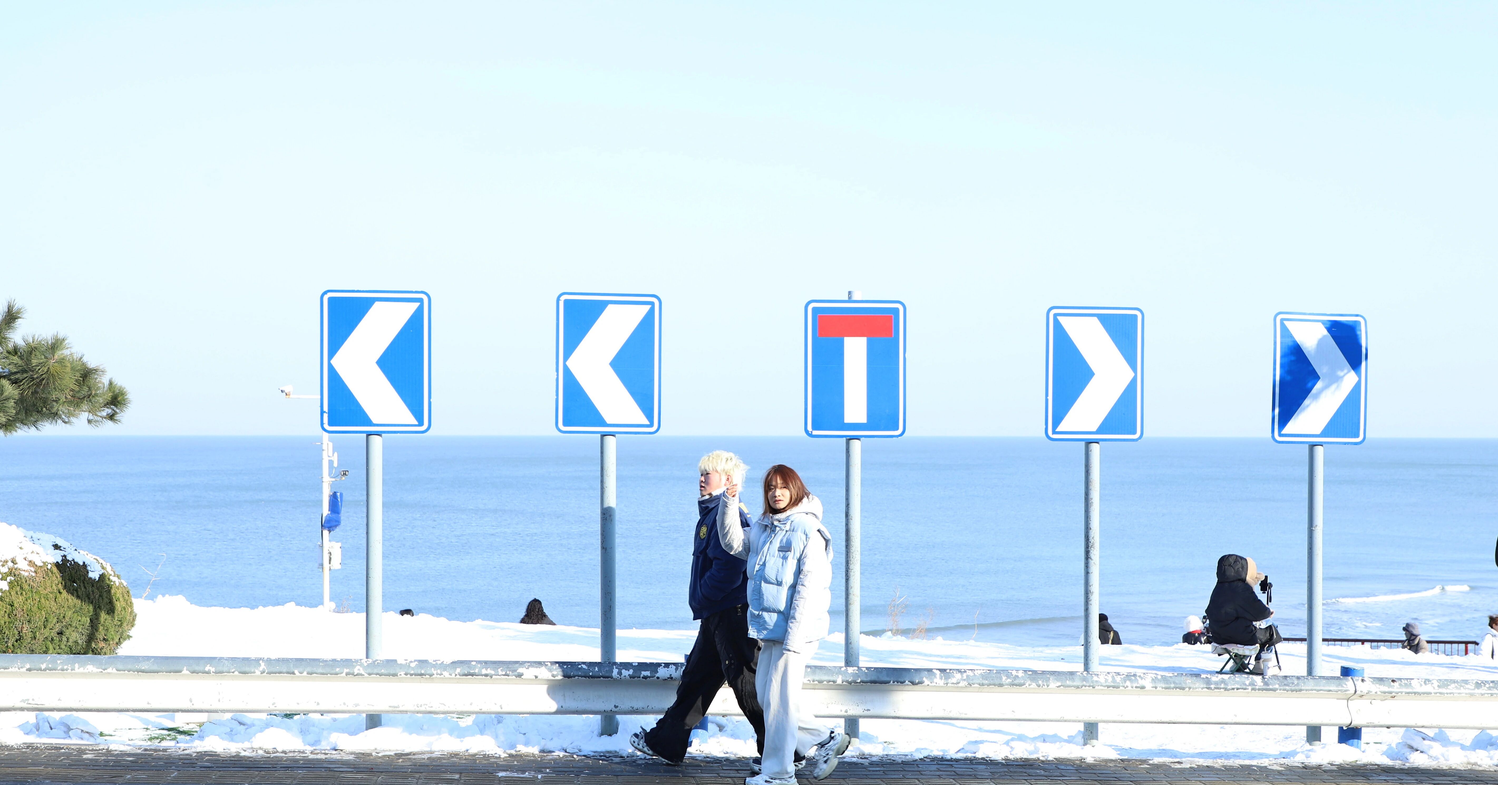 当雪花轻落在火炬八街,这条本就色彩明快的街道更添浪漫韵味。在这里,雪的纯净与海的辽阔”演绎得淋漓尽致。作为被誉为“威海小镰仓”的网红地,火炬八街南高北低的坡道被白雪覆盖,两侧暖白色建筑错落有致,尽头的蔚蓝大海与皑皑白雪形成鲜明对比,随手一拍都是氛围感拉满的冬日大片。游客们或漫步雪中街道,或用镜头定格美景,欢笑声与凛冽海风交织,更添惬意氛围。