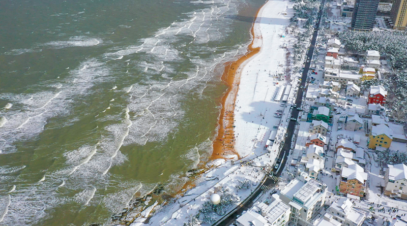 国际海水浴场一改夏日的喧嚣,尽显冬日特有的辽阔与纯净。沙滩上铺着一层薄薄的白雪,与蔚蓝海水形成鲜明对比,远处海鸥盘旋于雪海之间。不少游客沿着海岸线漫步,感受冬日海滨的清新与宁静。金海滩栈桥上,强风裹挟海水拍击栈桥铁链,凝结成晶莹冰挂。人们凭栏远眺,雪中海湾景色尽收眼底,海天一色的景象令人心旷神怡。