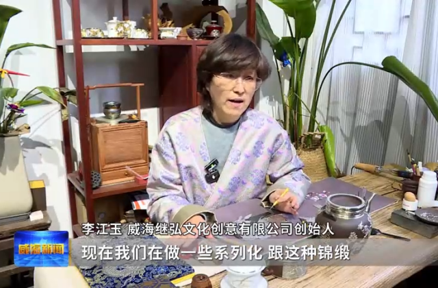 威海继弘文化创意有限公司创始人李江玉说,现在在做一些系列化,跟这种锦缎,因为锦缎上面的花纹极具东方色彩,也具有一定的历史,也很美,所以就想把刚硬的金属有色泽感的,跟布匹结合在一起,紧跟时代的脚步。