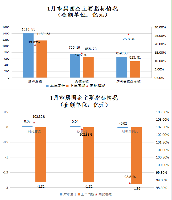 2026年1月末,14户市属国企资产总额1414.55亿元,同比增加232.02亿元,增长19.6%;负债总额755.19亿元,同比增加96.47亿元,增长14.6%;净资产659.36亿元,同比增加135.56亿元,增长25.9%,其中:归属于母公司的净资产598.9亿元,同比增加85.59亿元,增长16.7%;资产负债率53.39%,同比下降2.32个百分点。